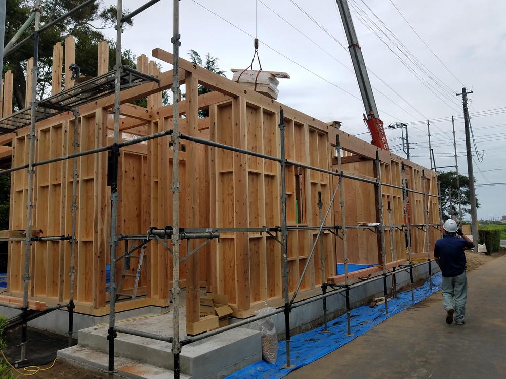 平屋上棟 1日目です(SD工法) 2018.09.14 大安吉日の青空のもと・・実際はどんよりの曇天でしたが・・N様邸の上棟を予定通り迎えることが出来ました。その建物、、地震に強い【壁倍率3.3倍】という国の認定を取っています。うーん、、数字ではなかなか伝わらないですよね。これでどうでしょうか ごめんなさい!みなさん・・当社で作る木造住宅、、口頭や文字で『感動』を伝えることはできませんが来て・見て・触ってもらうことでその素晴らしさは伝わります。本当に文字で説明するものではないのでぜひご来場ください!こちらです