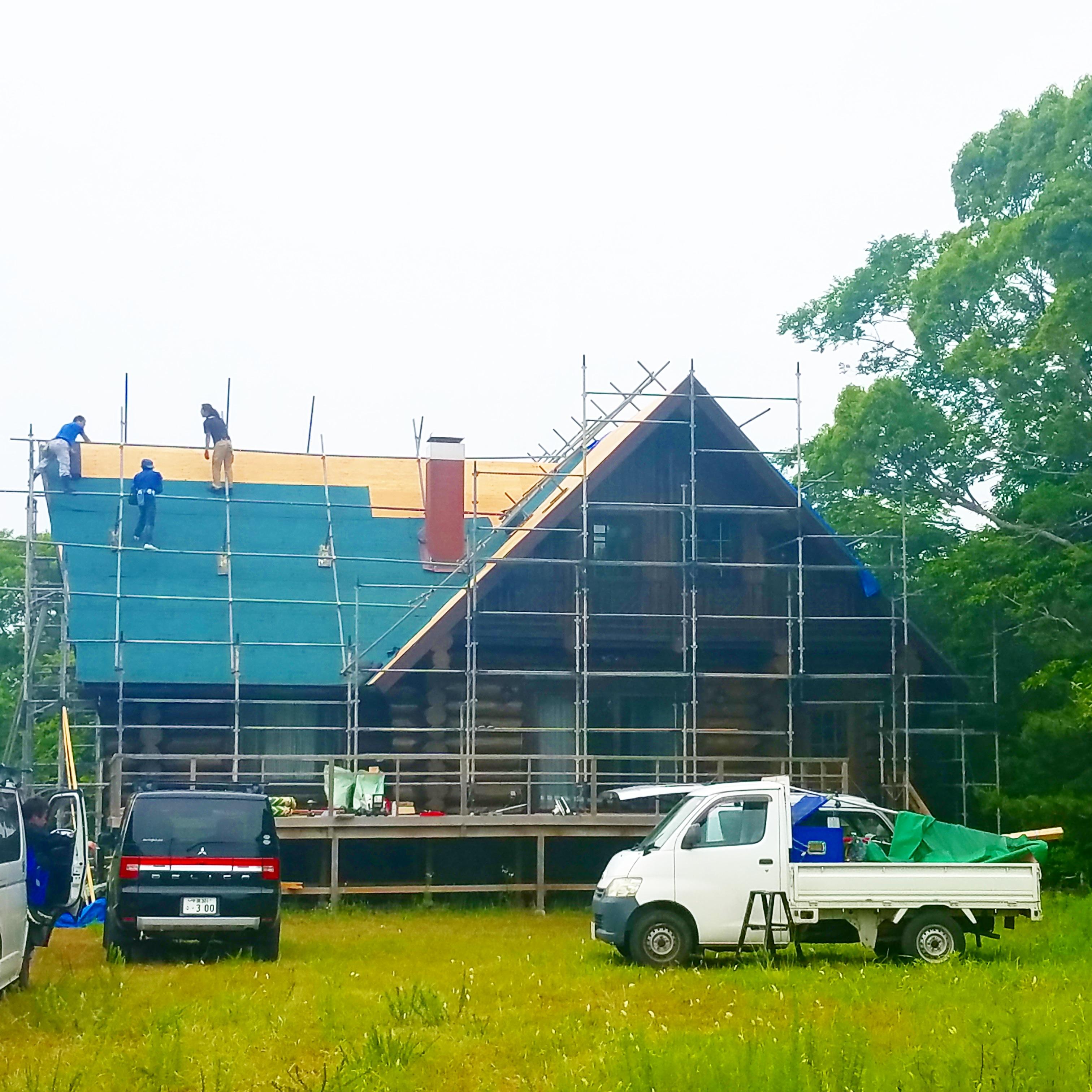 今回、外部の塗装(丸太、軒など)と屋根葺き替え工事を行っています。