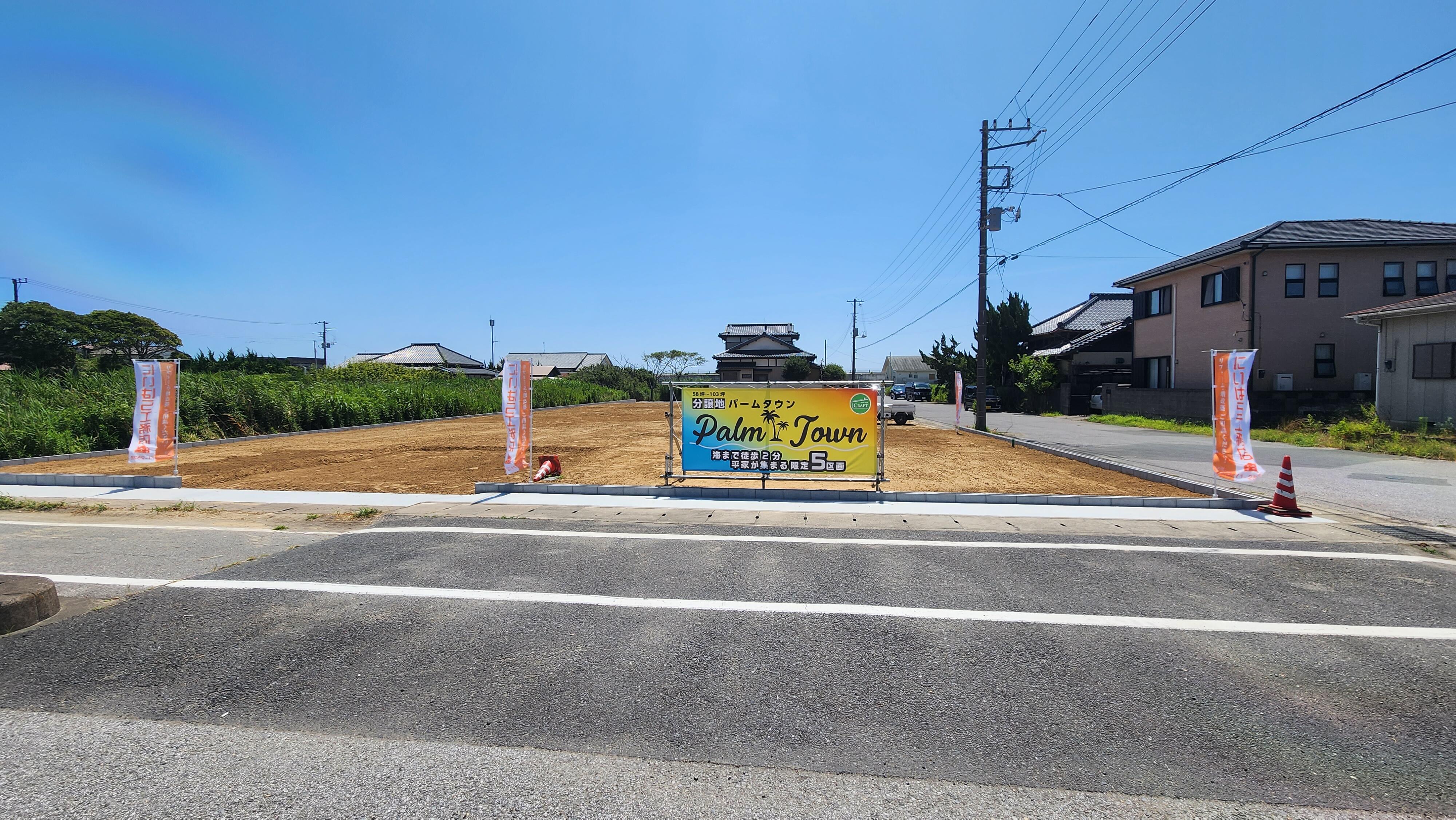 九十九里海沿い分譲地「パームタウン」 2023.07.23 5区画分譲地「PalmTown」の販売がスタートします。人気のサーフポイントまで徒歩2分!! 各区画、大きさも違うのでご興味ある方はご連絡ください。平屋スタイルだけが並ぶ街 「PalmTown」