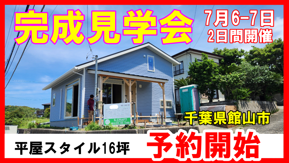 YouTubeにて先行告知しました千葉県館山市布沼での完成見学会!2日間。今回は【サーファーズハウス平屋16坪】になります。海近くの別荘地に完成する平屋スタイル16坪さらにロフト13帖が付いたコンパクトハウス!真夏の暑い時期の開催ということもあり、S-CRAFTの<遮熱工法>を体感する千載一遇のチャンスですよ!!ということで、ご予約はこちらから↓